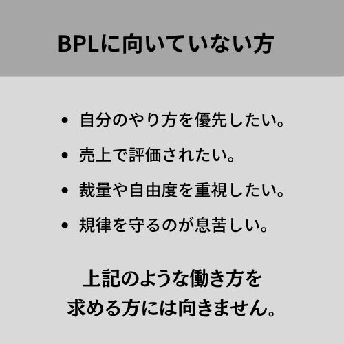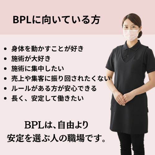 - BPLでは、働き方、評価、体の負担まで、最初から決められています。